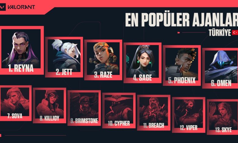 • Raze: Alan kontrolü ve yüksek patlayıcı hasarıyla rakiplerini alt eden bir ajandır. Geniş alanları temizlemek ve düşmanları şaşırtmak için idealdir.
